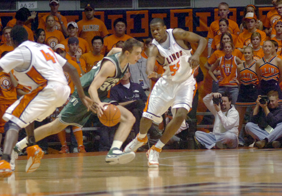 Chris Jones guarded by Dee Brown and Shaun Pruitt...